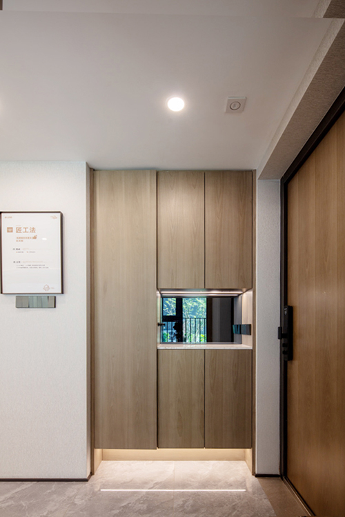 在收纳系统设计上,满足收纳容量同时,我们增加很多提升幸福感的小细节。独立玄关设计了多元化的收纳功能,增加鞋柜除菌功能,主卫镜柜配置美妆冰箱。